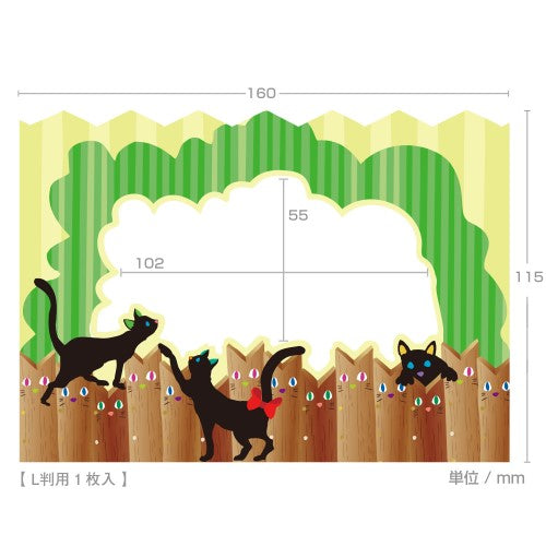 黒猫が集まってフェンスの上を歩いていますが、よく見るとそのフェンスが猫のデザインになっています。黒猫も仲間と勘違いして集まってきてるんでしょうか。そんなデザインが可愛いフォトフレームです。